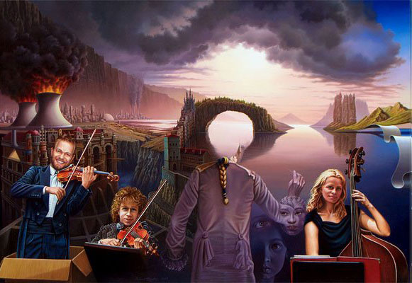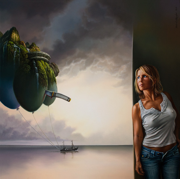 Ich setze meine grauen Wolken in leblose Landschaften, lass Licht auf eine altmeisterliche Miniaturlandschaft leuchten, zu denen ich oft in meinen Bildern Ausblicke, in verschiedene Perspektiven eröffne, zitiere und setze gelegentlich auch unterschiedlichste Komponenten und Aussagen zu einem Bild zusammen.