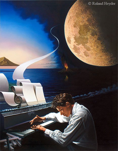 „Dali veränderte mein Leben“ sagt Heyder, „sein Werk ließ mir die Knie zittern und es fand sofort ein Dialog statt. So etwas wollte ich auch schaffen“. Heyders Bilder entstehen meist in den frühen Morgenstunden, zunächst im Kopf als Eingebung, dann konkretisiere sich alles zu einem Ganzen, berichtet er. Detailreich, politisch, zutiefst persönlich und intuitiv erzählen seine Werke Geschichten, die auf den ersten Blick gar nicht zu entziffern sind. „Manchmal erklären sich die Dinge auch erst Jahre später und meine Bilder bleiben damit für mich immer aktuell“ sagt Roland Heyder, dessen Heimat sich laut eigener Aussage „um den Bodensee“ bewege.